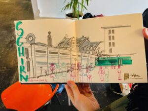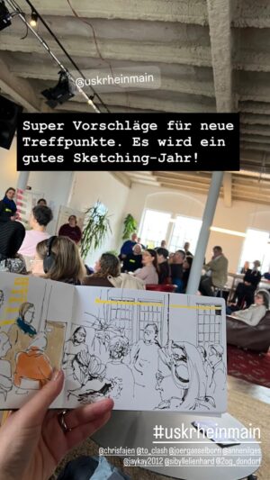 „Fröhlich sein!“ heißt die aktuelle Ausstellung in der Schirn – Fröhlich sein beim Urban Sketching mit USk Rhein-Main! Viel Spaß!